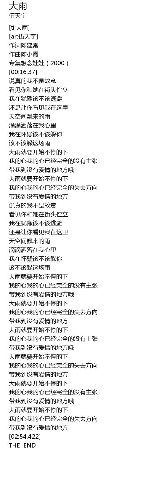 | [02:44.727] | dà yǔ jiù yào kāi shǐ bù tíng de xià |