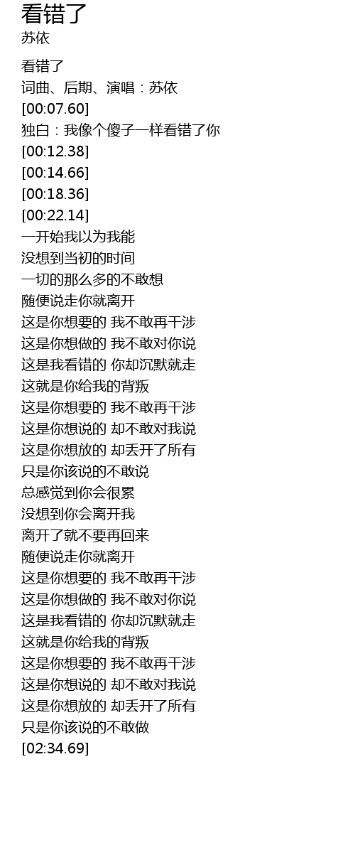 | [00:04.38] | 词曲、后期、演唱:苏依 |