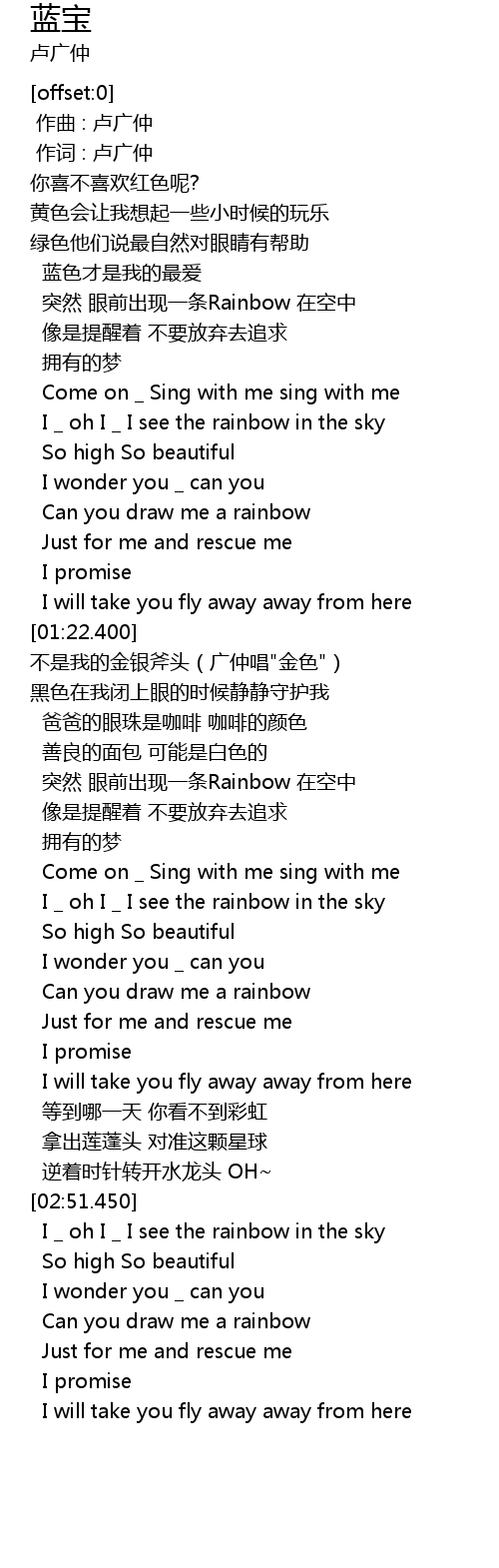 | [01:50.0] | 突然 眼前出现一条Rainbow 在空中 |