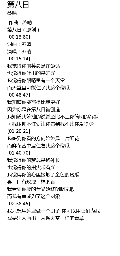 | [00:56.50] | yīn wèi nǐ shì zài dì bā rì bèi chuàng zào |