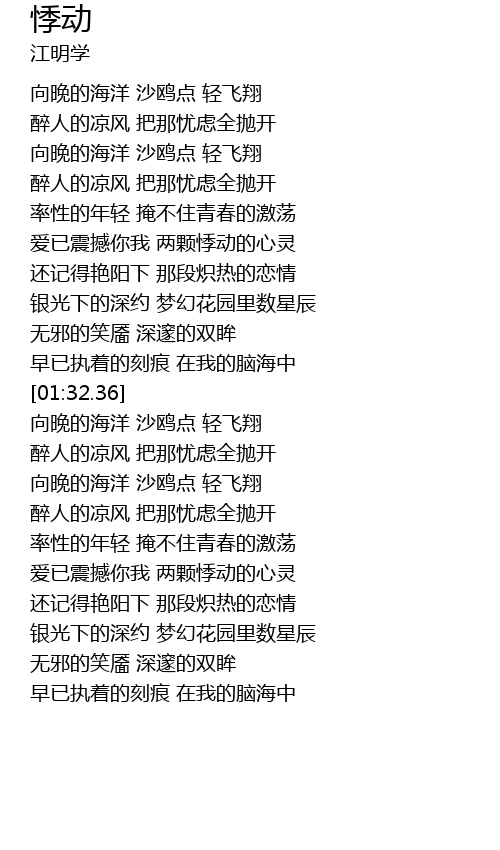 | [00:22.53] | 向晚的海洋 沙鸥点 轻飞翔 |