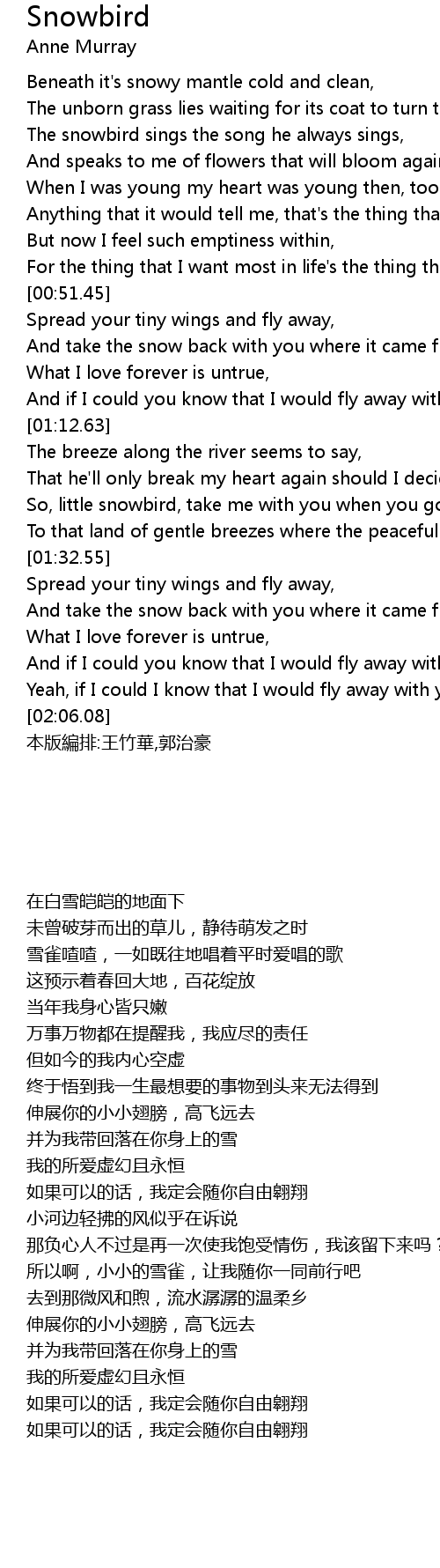 | [00:20.44] | The snowbird sings the song he always sings, |