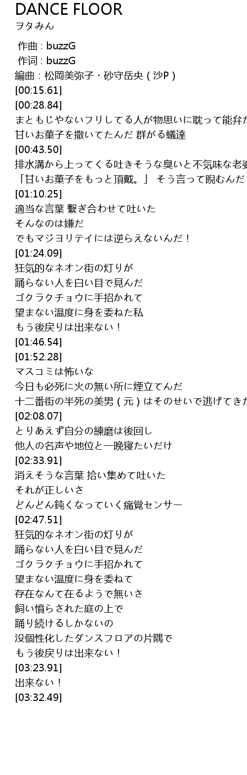 | [03:09.25] | 踊り続けるしかないの 没個性化したダンスフロアの片隅で |