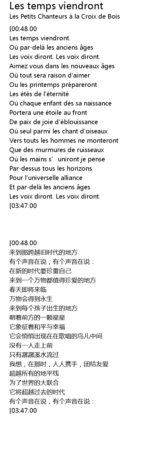 | [00:10.00][00:48.00][01:27.00][02:03.00][02:40.00][03:13.00] | Les temps viendront. Les temps viendront. |
