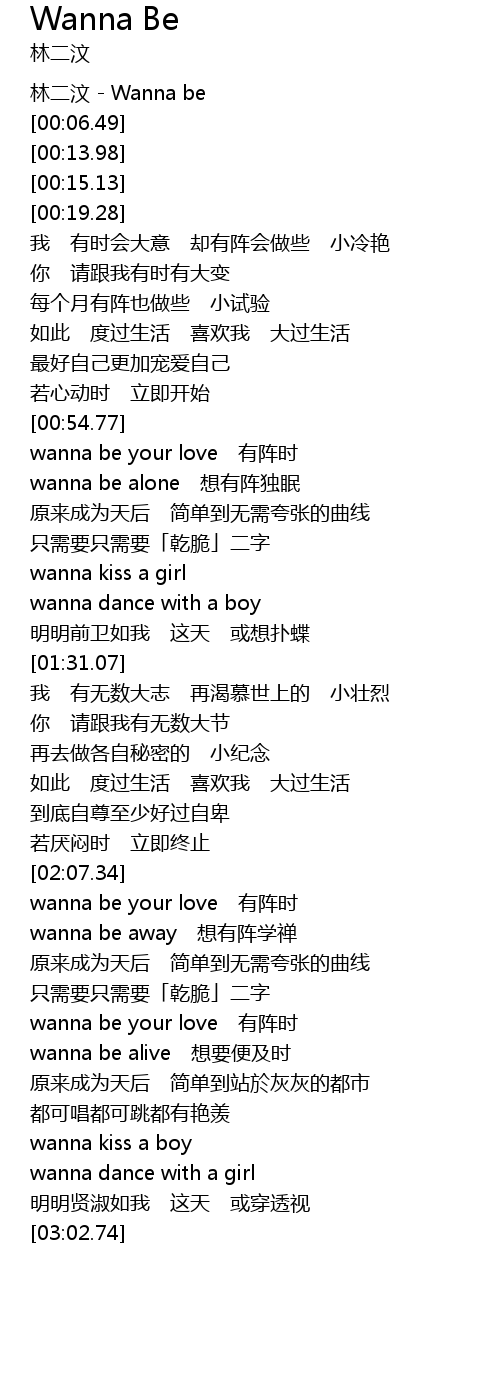| [00:00.15] | lín èr wèn Wanna be |