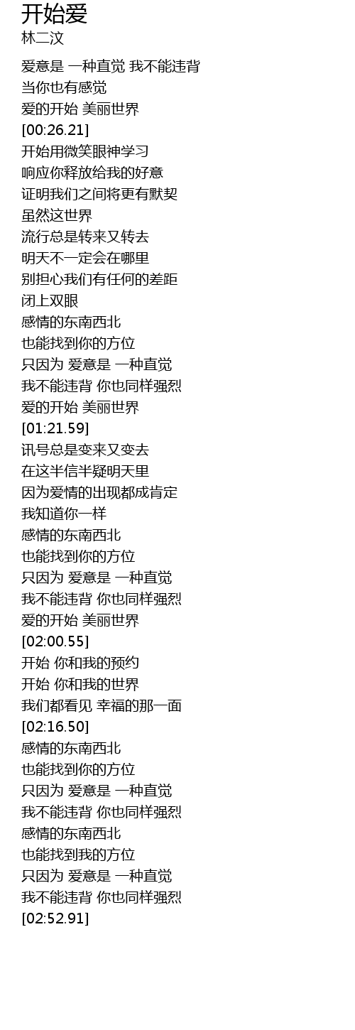 | [01:58.59] | 爱的开始 美丽世界 |