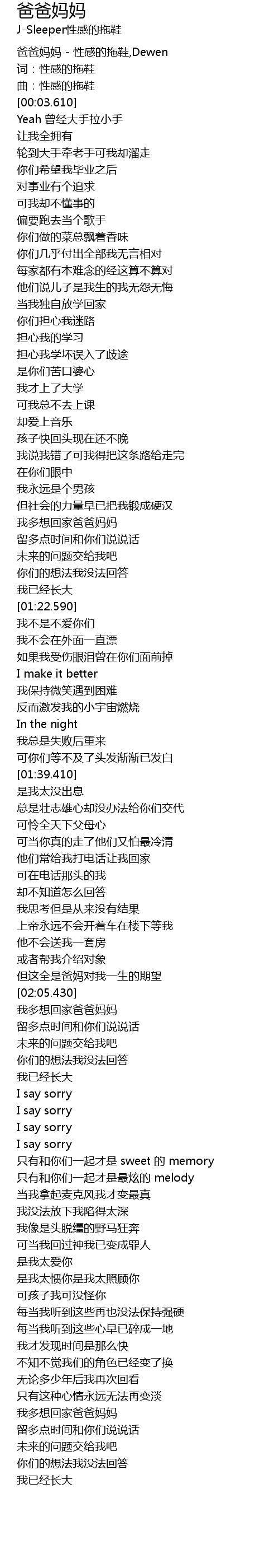 | [00:00.030] | 爸爸妈妈 - 性感的拖鞋,Dewen |