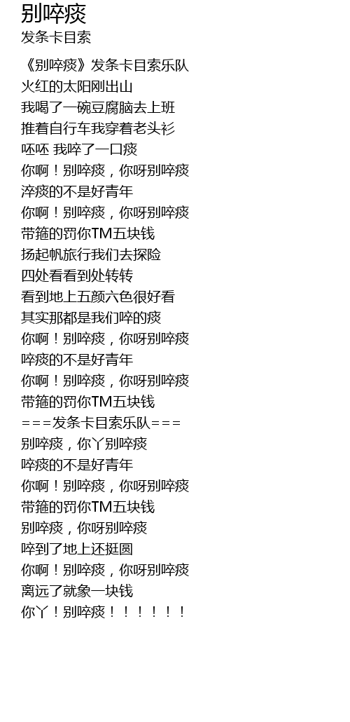 | [00:03.66] | 《别啐痰》发条卡目索乐队 |