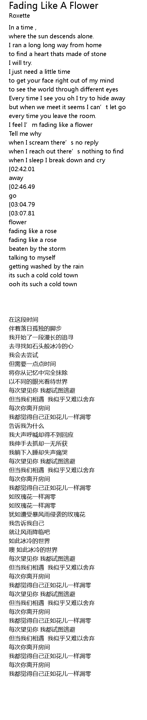 | [03:22.52][03:07.81][02:51.60][02:37.15][01:42.45] | I feel I' m fading like a flower |