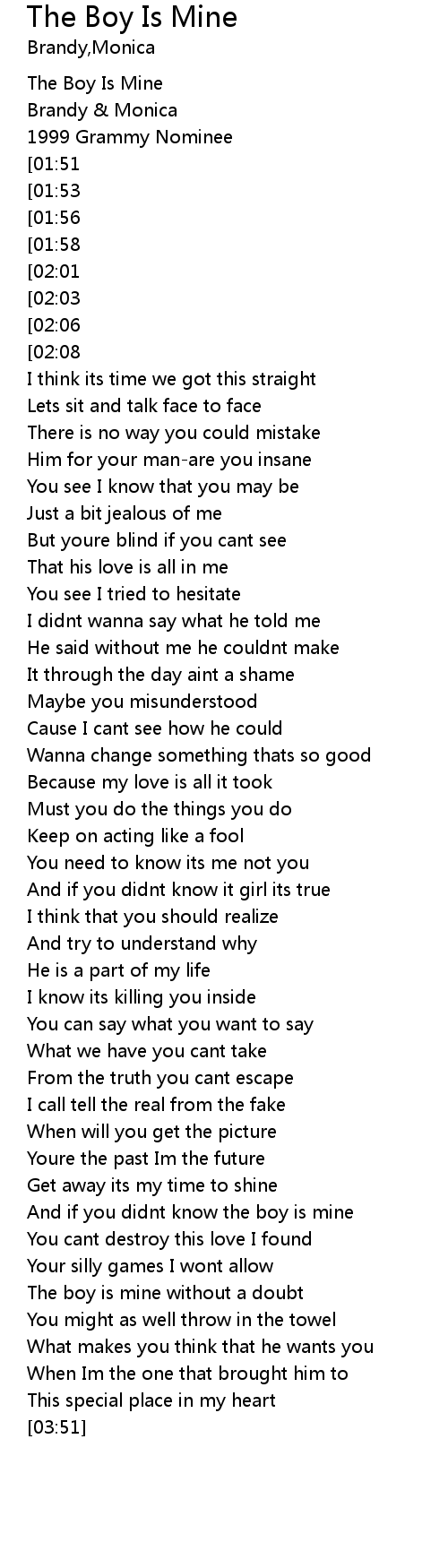 | [01:07][02:08][03:10][03:30][04:11][04:32][04:52] | The boy is mine |