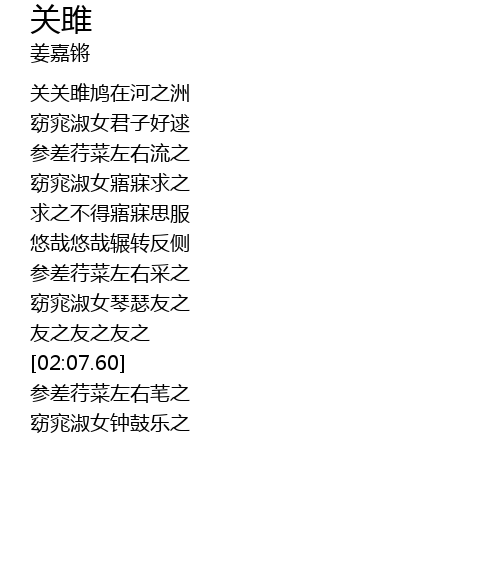 | [00:22.00] | 关关雎鸠在河之洲 |