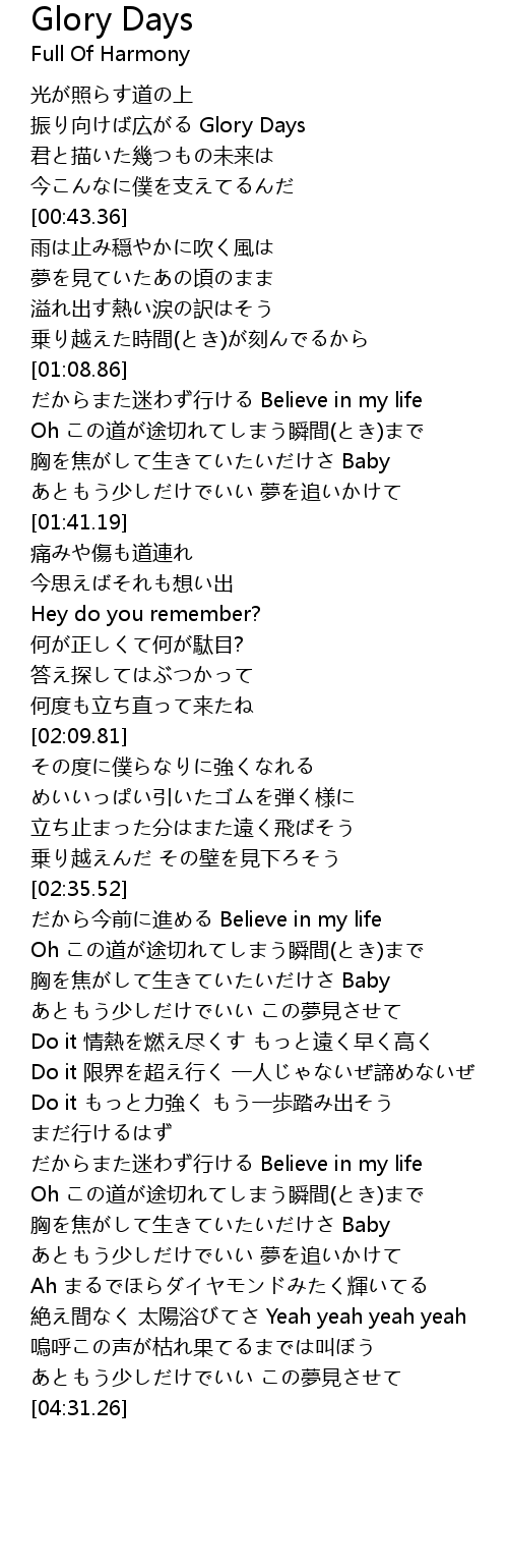 | [00:24.13] | 振り向けば広がる Glory Days |