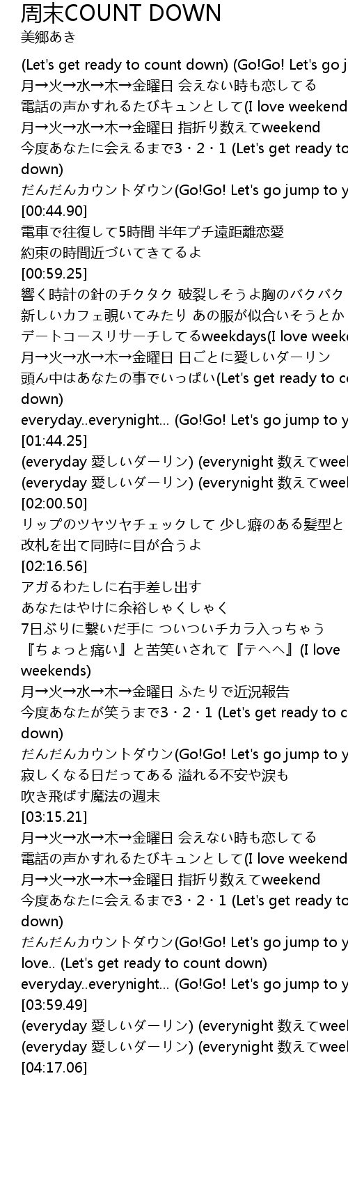 | [03:32.82] | 月→火→水→木→金曜日 指折り数えてweekend |