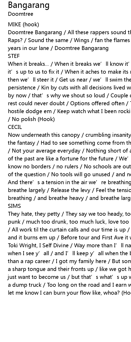 | Doomtree Bangarang All these rappers sound the same Beats? Sound the same Raps? Sound the same Wings fan the flames Teeth with the fangs 10 years in our lane Doomtree Bangarang | |