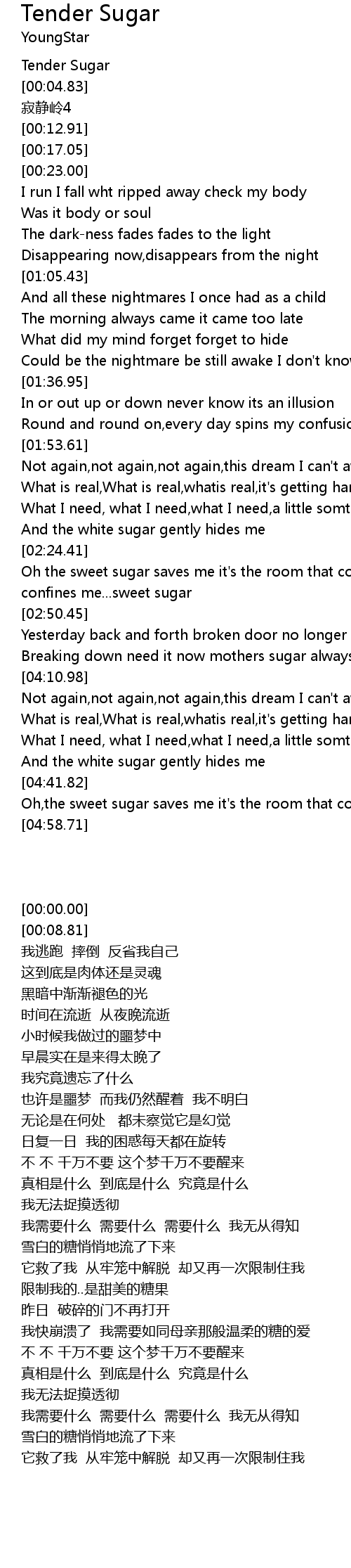 | [04:42.57] | Oh,the sweet sugar saves me it's the room that confines me |