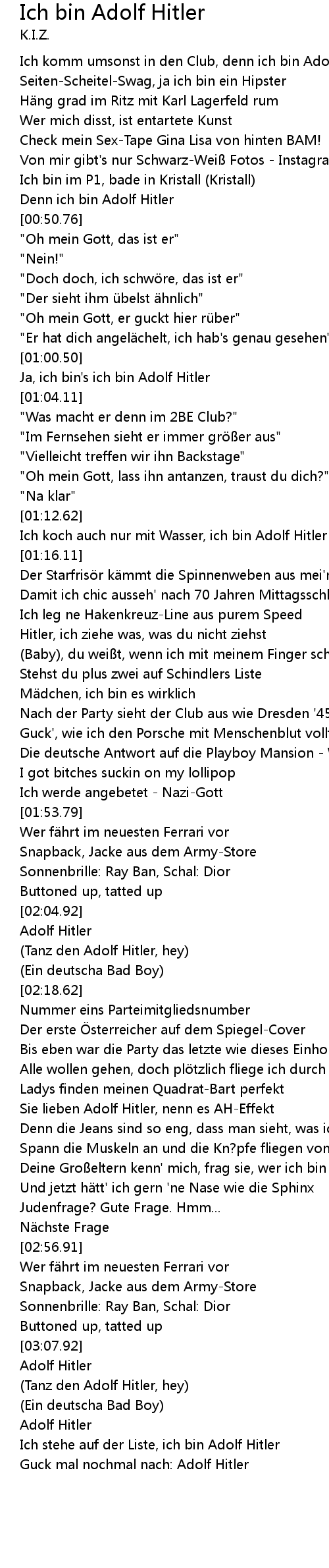| [00:25.30] | Ich komm umsonst in den Club, denn ich bin Adolf Hitler |
