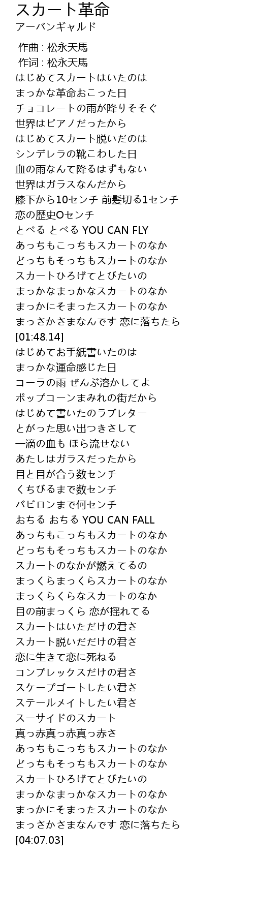| [01:38.77] | まっかにそまったスカートのなか |