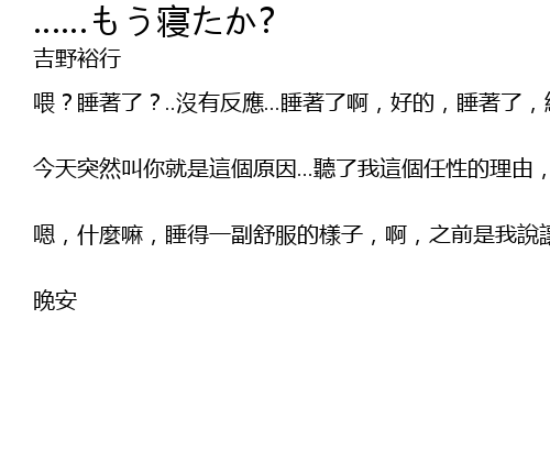 | 嗯,什麼嘛,睡得一副舒服的樣子,啊,之前是我說讓你睡的...好了,快起來吧,吶...嗯,不醒啊~真是不聽話的傢伙,一副嬰兒的樣子,做了什麽夢呢?嗯,因為是誰在我旁邊,做除了我以外的夢就不能原諒了~~我也睡吧~早上起床之後要做比kiss還舒服的事哦 | |