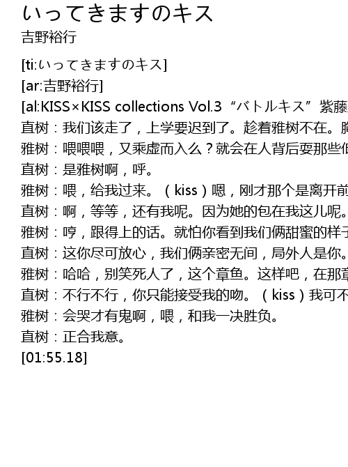 | [00:54.35] | ya shu: wei, gei wo guo lai. kiss , gang cai na ge shi li kai qian de wen hou wen. wo men zou lou. |