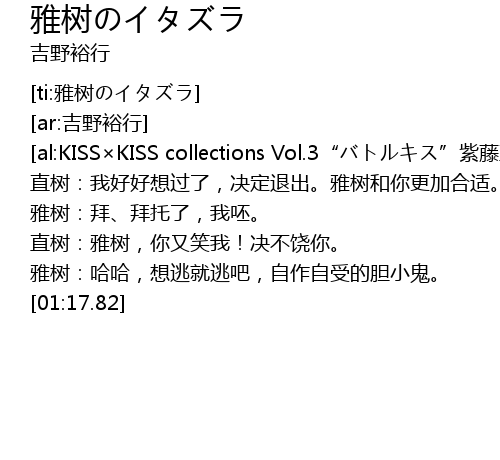 | [01:04.56] | 雅树:拜、拜托了,我呸。 |