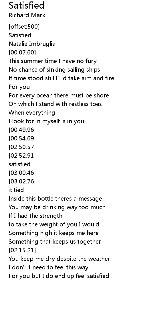 | [03:12.56][02:52.91][02:33.30][01:51.78][01:02.77] | Is just enough to keep you satisfied |