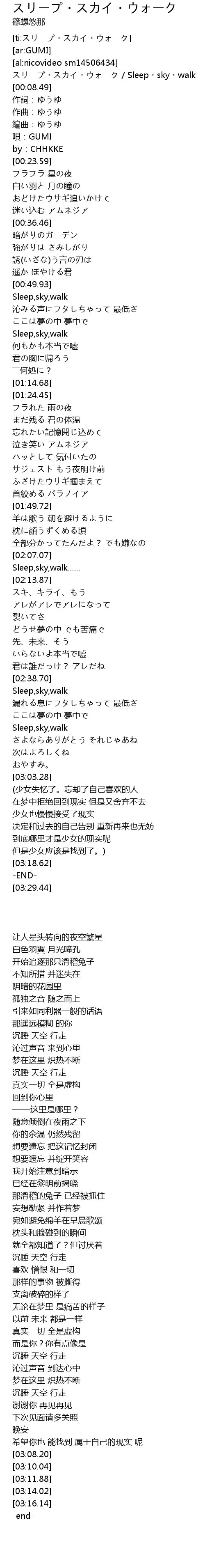 | [02:51.11] | Sleep, sky, walk |