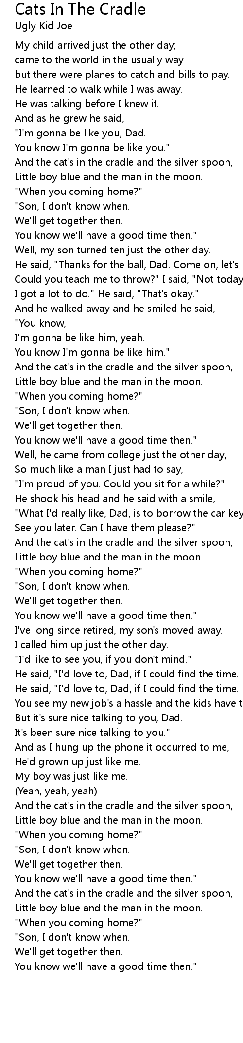 And the cat's in the cradle and the silver spoon, |