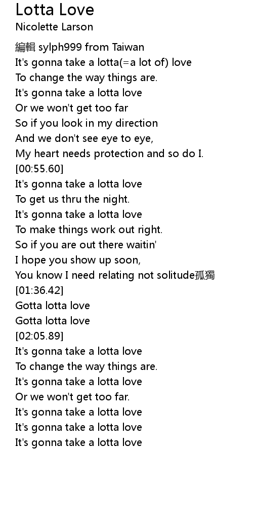 | [00:17.23] | It's gonna take a lotta(=a lot of) love |