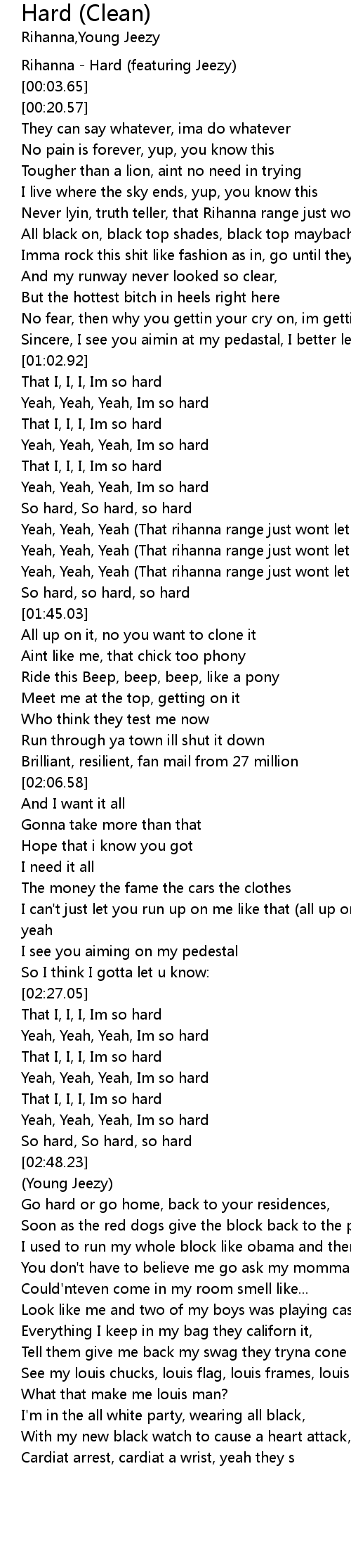 | [00:00.43] | Rihanna - Hard (featuring Jeezy) |