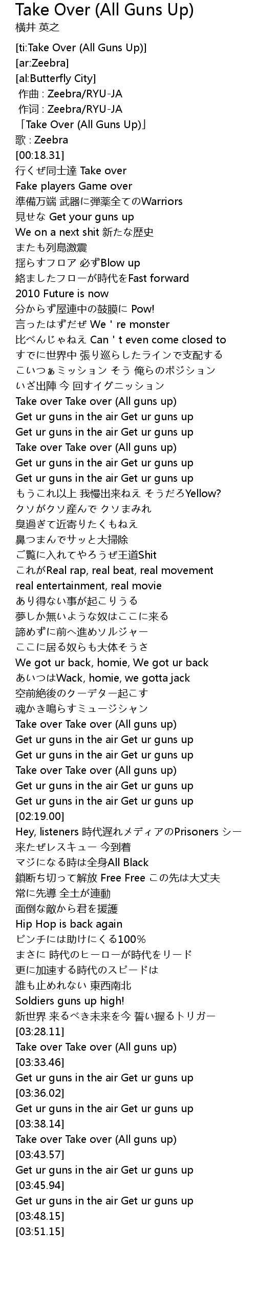 | [00:01.31] | 「Take Over (All Guns Up)」 |