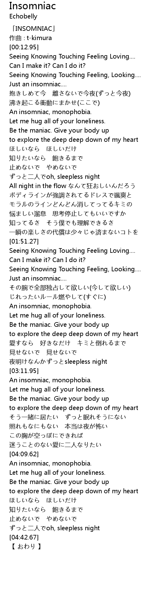| [04:11.03] | An insomniac, monophobia. |