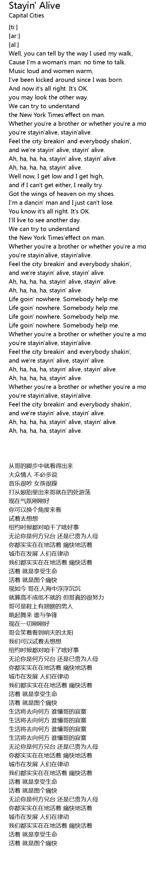 Ah, ha, ha, ha, stayin' alive, stayin' alive. |