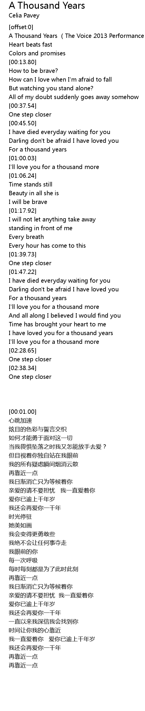 | [00:01.00] | A Thousand Years (The Voice 2013 Performance) - Celia Pavey |