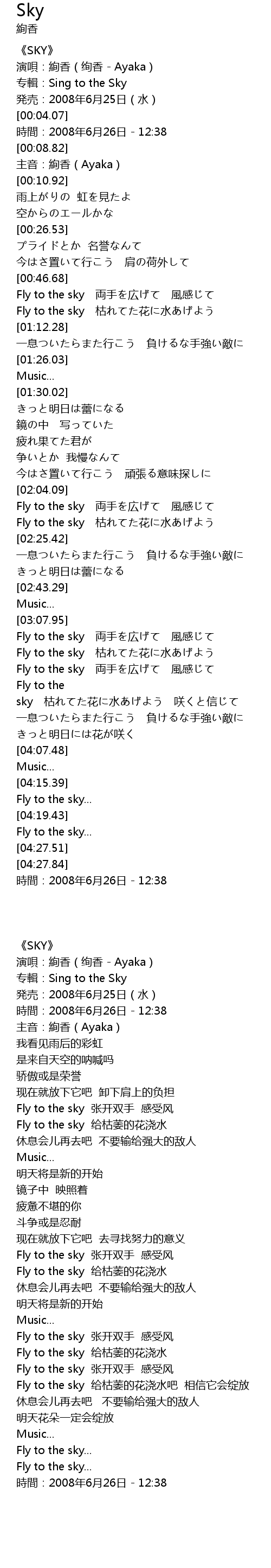 | [02:04.42] | Fly to the sky 両手を広げて 風感じて |