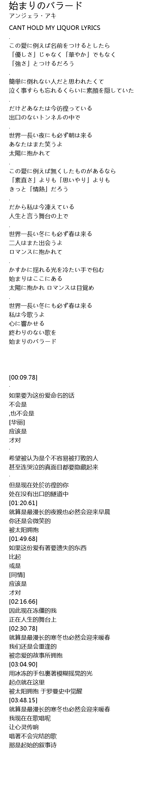 | [00:09.78] | CANT HOLD MY LIQUOR LYRICS |