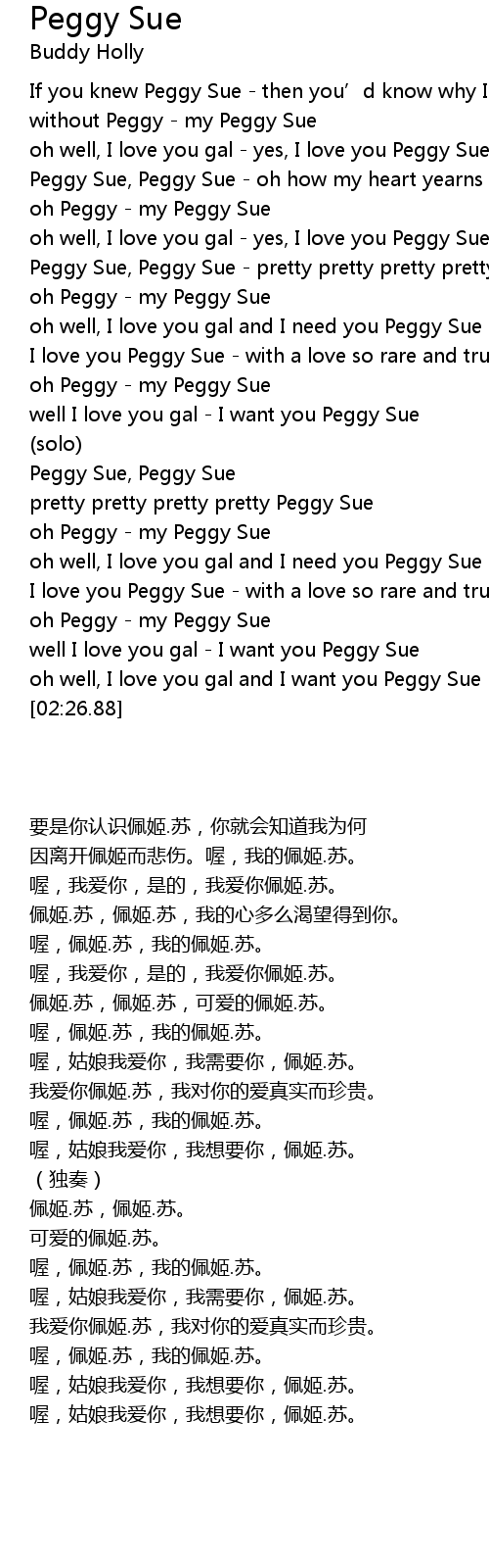 | [00:23.18] | Peggy Sue, Peggy Sue - oh how my heart yearns for you |