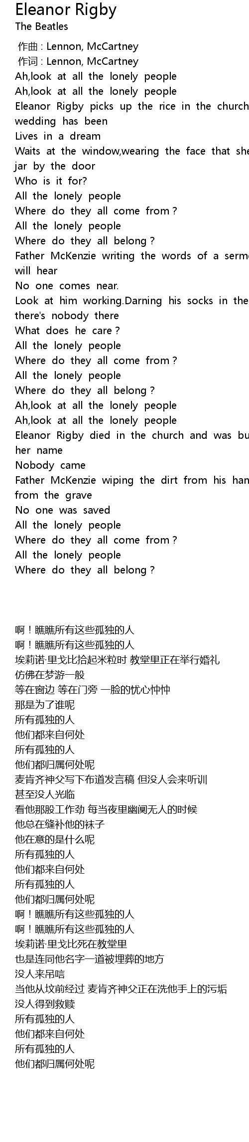 | [00:00.299] | Ah,look at all the lonely people |