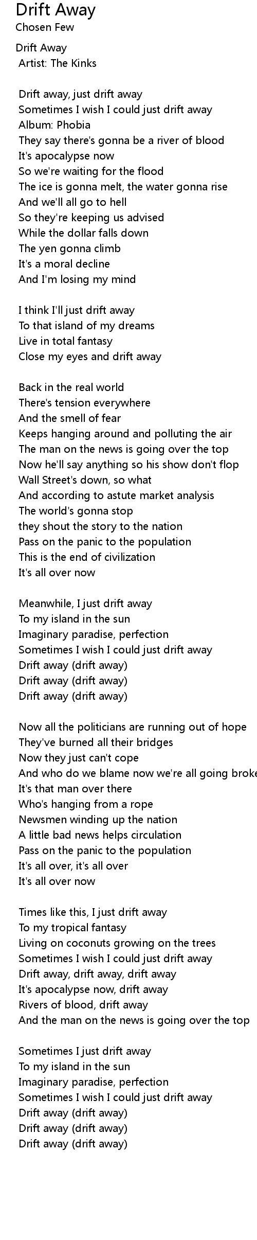 Drift away, drift away, drift away |