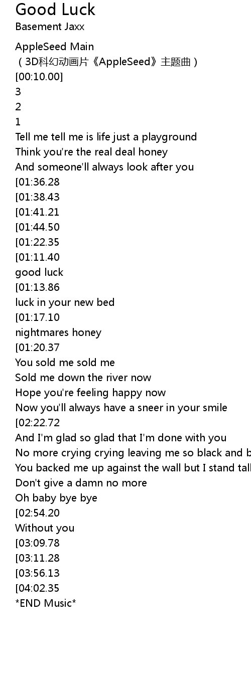 | [00:58.80][01:11.40][02:01.19][02:13.68][03:16.11][03:28.50][03:40.94] | Good luck good luck |
