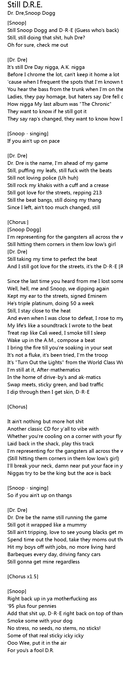 And I still got love for the streets, it's the D-R-E [Repeat 2x]