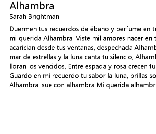 | Duermen tus recuerdos de ébano y perfume en tus aposentos, llenos de ternura, mi querida Alhambra. Viste mil amores nacer en tus entrañas, luces que acarician desde tus ventanas, despechada Alhambra. Brillan tus ensueños en un mar de estrellas y la luna canta tu silencio, Alhambra. Lágrimas de yedra lloran los vencidos, Entre espada y rosa crecen tus olivos, mi querida Alhambra. Guardo en mi recuerdo tu sabor la luna, brillas sobre el pueblo como el sol, Alhambra. sue con alhambra Mi querida alhambra |