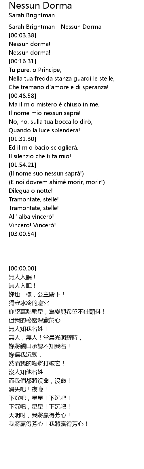 | [00:00.00] | Sarah Brightman - Nessun Dorma |