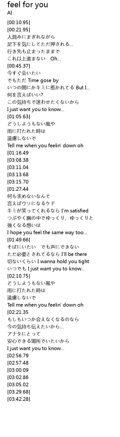 | [03:37.52][03:15.70][02:29.76][01:24.53] | Cause いつでも I feel for you… |