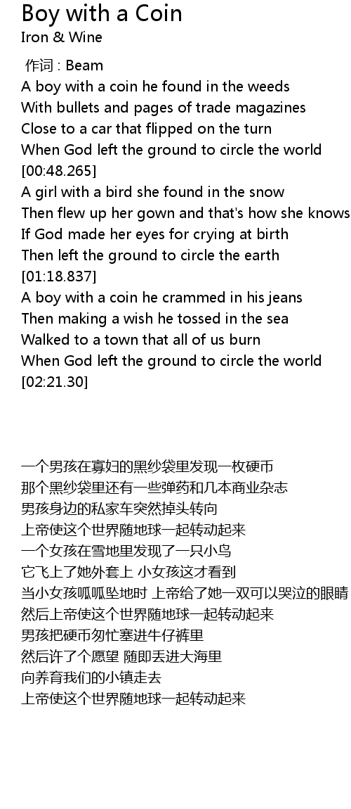 | [00:18.25] | A boy with a coin he found in the weeds |