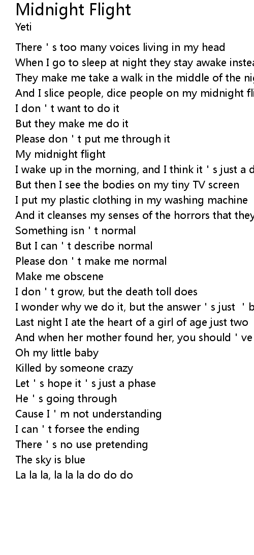 | [00:25.54] | And I slice people, dice people on my midnight flight |