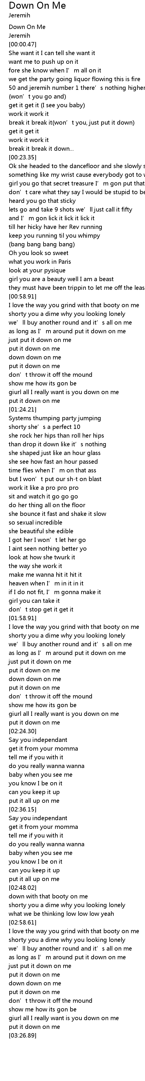 | [03:15.65] | put it down on me |