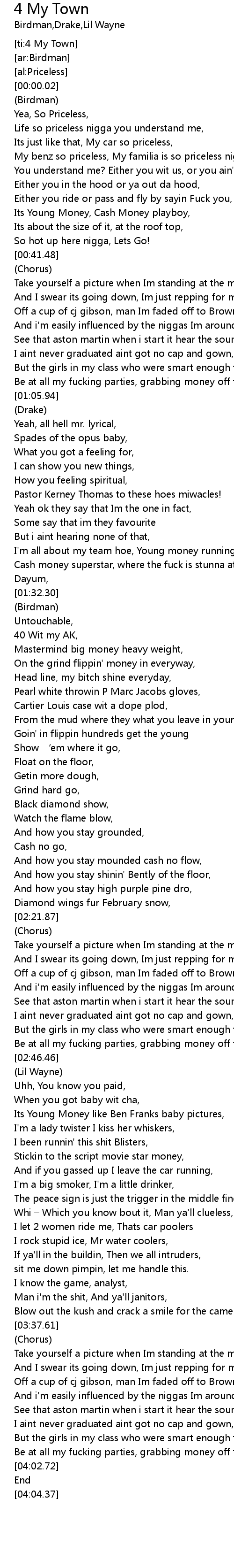 | [00:12.05] | My benz so priceless, My familia is so priceless nigga, |