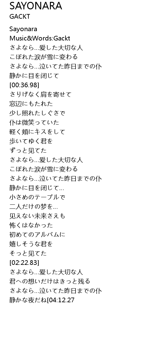 | [00:22.62] | さよなら…泣いてた昨日までの仆 |