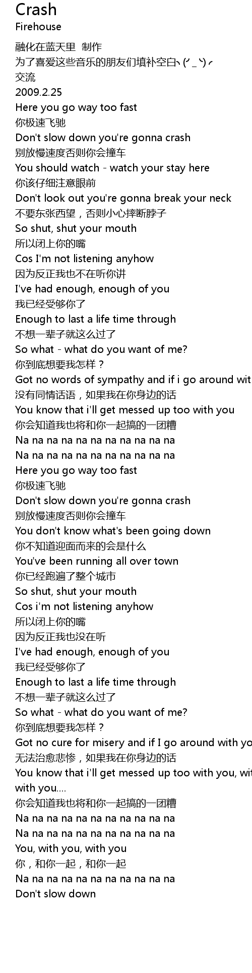 | [00:14.36] | Don' t slow down you' re gonna crash |