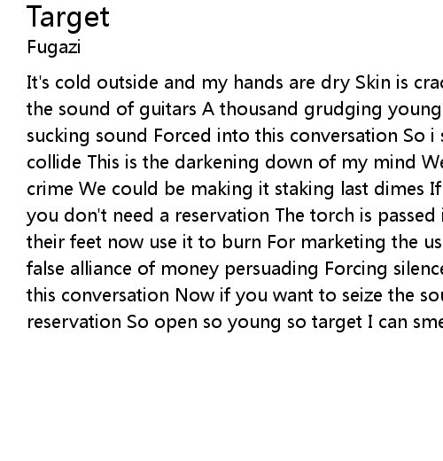 It's cold outside and my hands are dry Skin is cracked and I realize That I hate the sound of guitars A thousand grudging young millionaires Forcing silence sucking sound Forced into this conversation So i say shine let their planets collide This is the darkening down of my mind We could be making it oiling like crime We could be making it staking last dimes If you want to seize the sound you don't need a reservation The torch is passed it's yours to return Lay at their feet now use it to burn For marketing the use of the word generation A false alliance of money persuading Forcing silence sucking sound Forced into this conversation Now if you want to seize the sound you don't need a reservation So open so young so target I can smell your heart you're a target |
